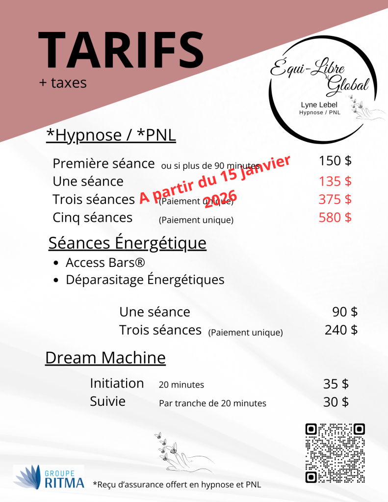 Tarifs (ancien jusqu’au 14 janvier 2026 et Nouveau à partir du 15 janvier 2026)